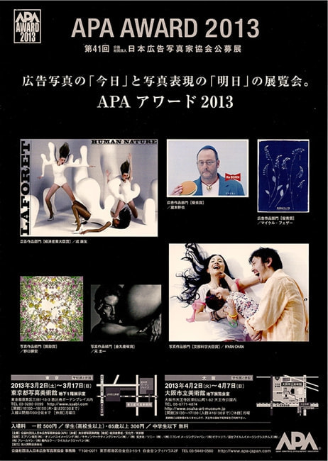 APAアワード2013 第41回公益社団法人日本広告写真家協会公募展の【広告作品部門】と【写真作品部門】にダブル入選しました。【広告作品部門】ではベネッセコーポレーションの駅張りポスターが、【写真作品部門】では奈良県黒滝村で撮影の「コブナツリシ カノカワ」が入選しました。作品は平成25年3月から東京都写真美術館と大阪市立美術館で展示、同じく3月発刊の「年鑑日本の広告写真」に掲載されます。
