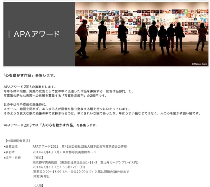 公益社団法人日本広告写真家協会主催の【APAアワード2013】の展覧会が始まりました。名畑文巨は写真作品部門と広告写真部門の両方で入選しています。