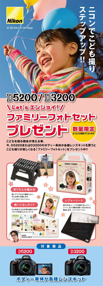 【ニコンD5200/D3200ファミリーフォトセットプレゼント】キャンペーン用に、運動会や七五三などでの子ども写真の撮り方を解説した小冊子の撮影をしました。キャンペーン取扱店で、D5200/D3200レンズキット、またはボディを購入するとついてきます。