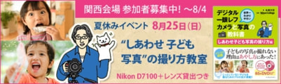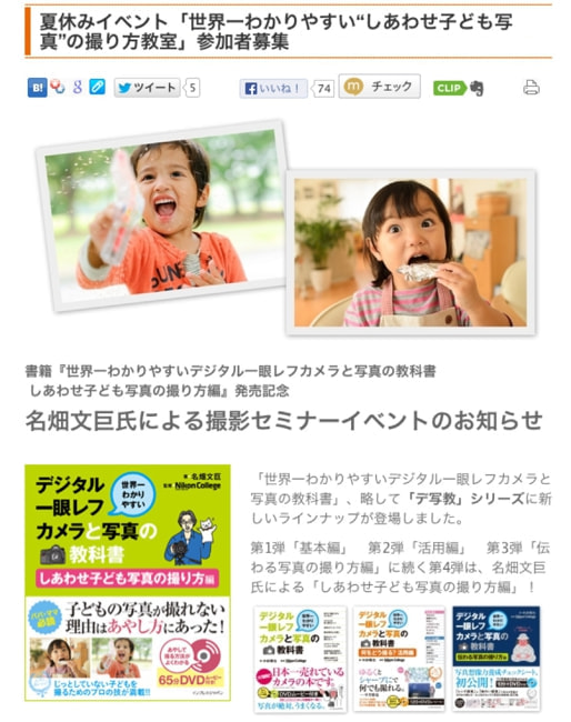 参加費は2000円で、新刊の「世界一わかりやすいデジタル一眼レフカメラと写真の教科書 しあわせ子ども写真の撮り方編」がプレゼントされます。ただいま参加者募集中!