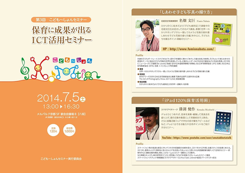株式会社サンワード主催の保育士さんが対象の「保育に成果が出るICT活用セミナー」(於:メルパルク京都)において、名畑文巨の「しあわせ子ども写真の撮り方」の講座を開きました。